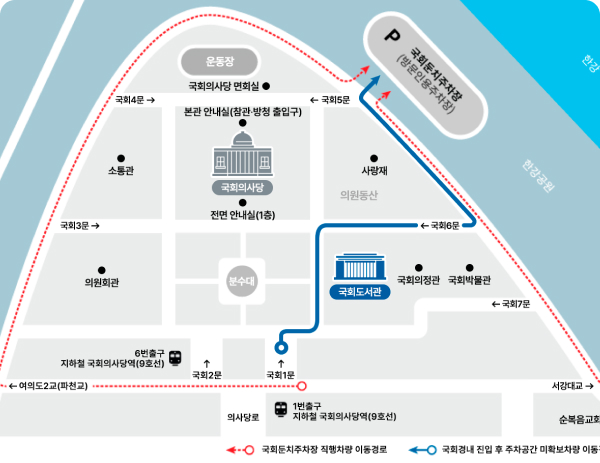 단체 참관(방문)의 버스는 동문과 남문으로 출입하여 참관(방문)자를 하차시킨 후 국회 둔치 주차장에 주차하여 주시기 바랍니다.